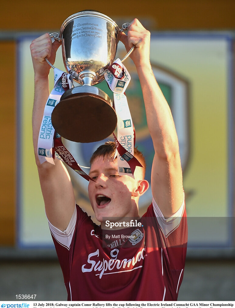 13 July 2018; Galway captain Conor Raftery lifts the cup following the Electric Ireland Connacht GAA Minor Championship Final match between Roscommon and Galway at Dr Hyde Park in Roscommon. Photo by Matt Browne/Sportsfile