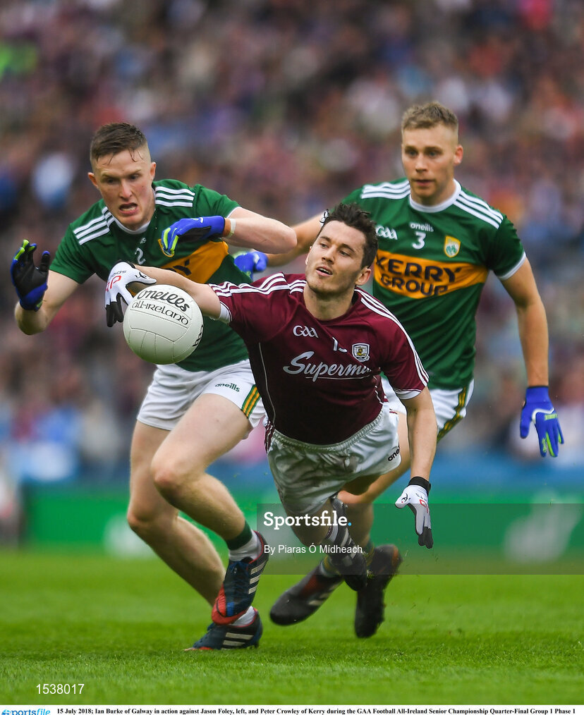 15 July 2018; Ian Burke of Galway in action against Jason Foley, left, and Peter Crowley of Kerry during the GAA Football All-Ireland Senior Championship Quarter-Final Group 1 Phase 1 match between Kerry and Galway at Croke Park, Dublin. Photo by Piaras Ó Mídheach/Sportsfile