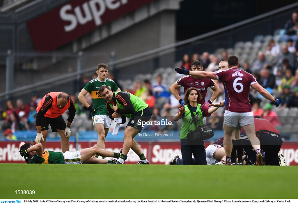 15 July 2018; Seán O’Shea of Kerry and Paul Conroy of Galway receive medical attention during the GAA Football All-Ireland Senior Championship Quarter-Final Group 1 Phase 1 match between Kerry and Galway at Croke Park, Dublin. Photo by David Fitzgerald/Sportsfile