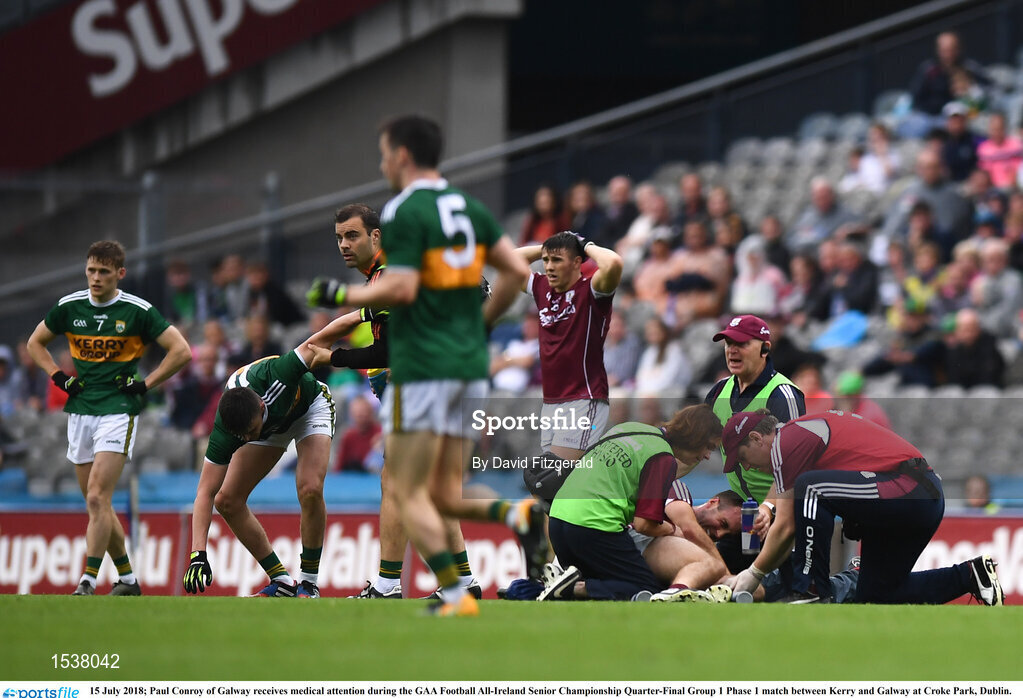15 July 2018; Paul Conroy of Galway receives medical attention during the GAA Football All-Ireland Senior Championship Quarter-Final Group 1 Phase 1 match between Kerry and Galway at Croke Park, Dublin. Photo by David Fitzgerald/Sportsfile
