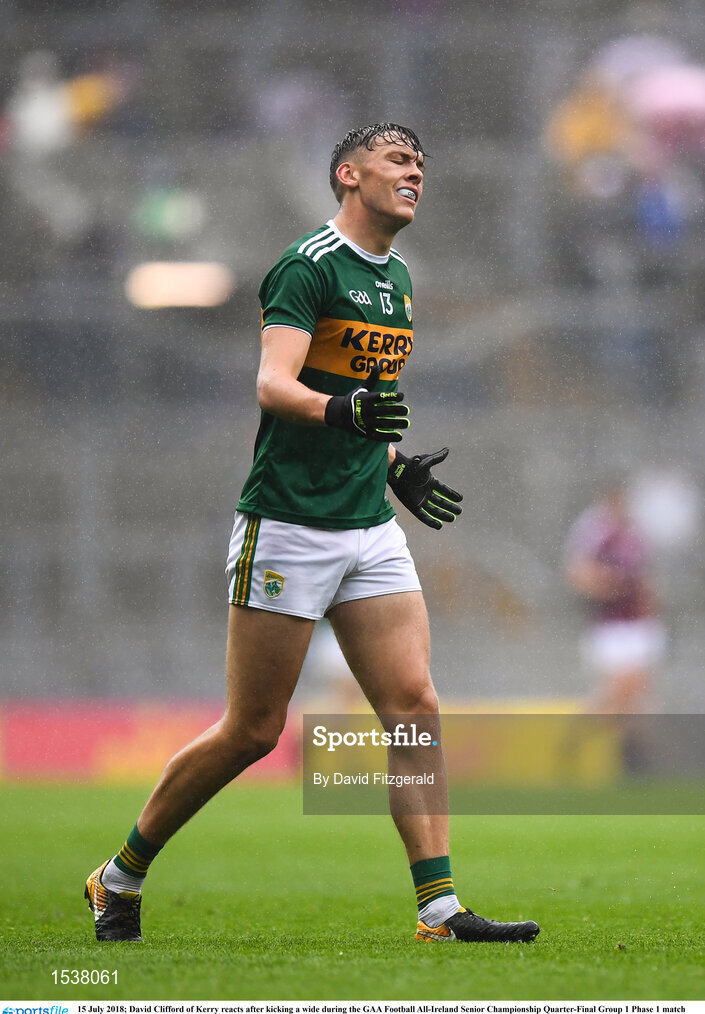 15 July 2018; David Clifford of Kerry reacts after kicking a wide during the GAA Football All-Ireland Senior Championship Quarter-Final Group 1 Phase 1 match between Kerry and Galway at Croke Park, Dublin. Photo by David Fitzgerald/Sportsfile