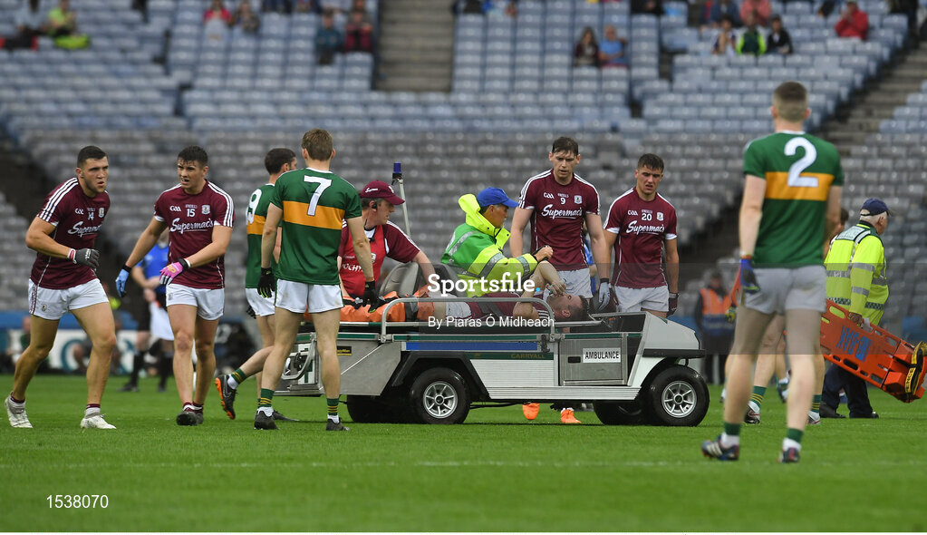 15 July 2018; Paul Conroy of Galway is helped off the field on a stretcher after picking up an injury during the GAA Football All-Ireland Senior Championship Quarter-Final Group 1 Phase 1 match between Kerry and Galway at Croke Park, Dublin. Photo by Piaras Ó Mídheach/Sportsfile
