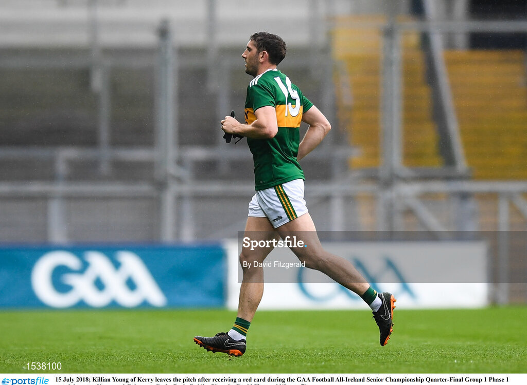 15 July 2018; Killian Young of Kerry leaves the pitch after receiving a red card during the GAA Football All-Ireland Senior Championship Quarter-Final Group 1 Phase 1 match between Kerry and Galway at Croke Park, Dublin. Photo by David Fitzgerald/Sportsfile