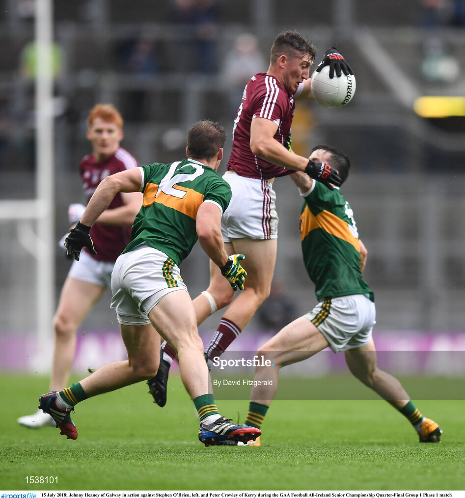 15 July 2018; Johnny Heaney of Galway in action against Stephen O’Brien, left, and Peter Crowley of Kerry during the GAA Football All-Ireland Senior Championship Quarter-Final Group 1 Phase 1 match between Kerry and Galway at Croke Park, Dublin. Photo by David Fitzgerald/Sportsfile