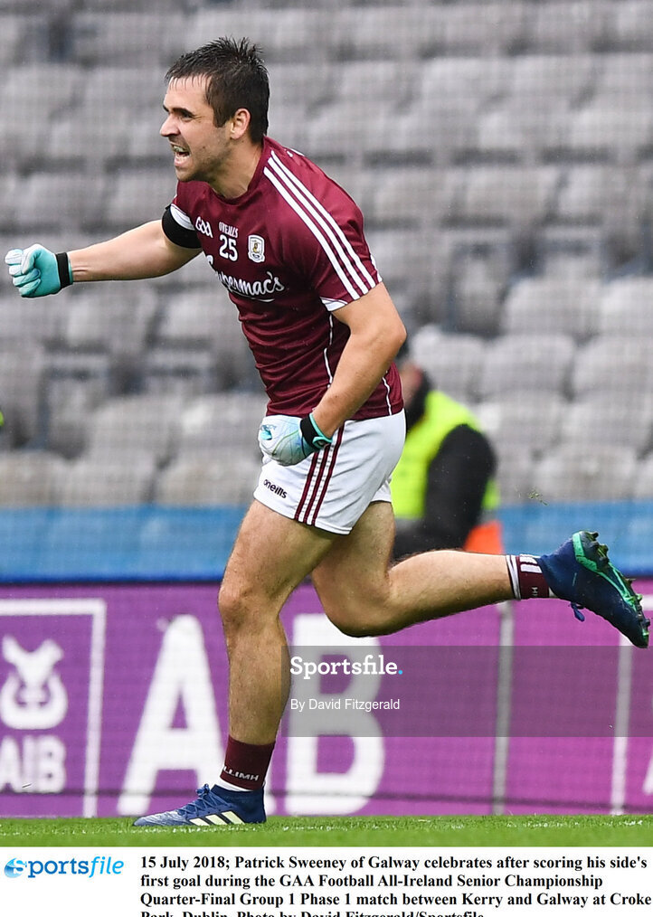 15 July 2018; Patrick Sweeney of Galway celebrates after scoring his side's first goal during the GAA Football All-Ireland Senior Championship Quarter-Final Group 1 Phase 1 match between Kerry and Galway at Croke Park, Dublin. Photo by David Fitzgerald/Sportsfile