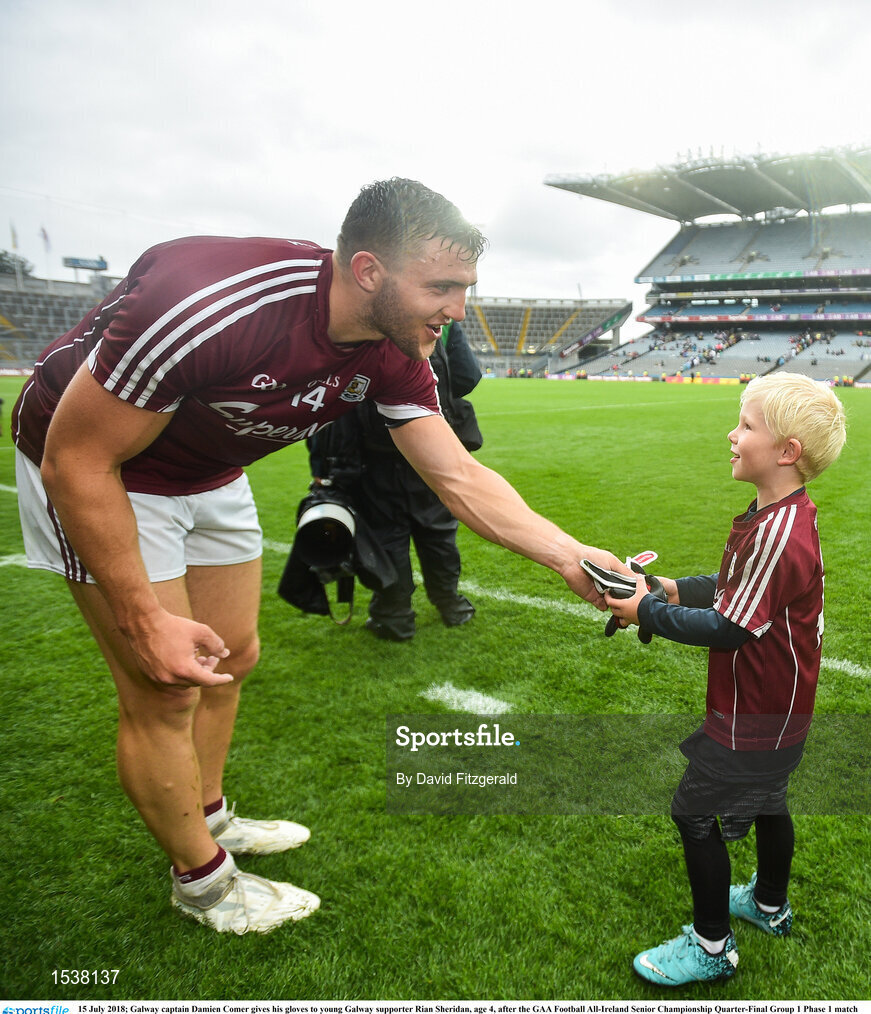 15 July 2018; Galway captain Damien Comer gives his gloves to young Galway supporter Rian Sheridan, age 4, after the GAA Football All-Ireland Senior Championship Quarter-Final Group 1 Phase 1 match between Kerry and Galway at Croke Park, Dublin. Photo by David Fitzgerald/Sportsfile