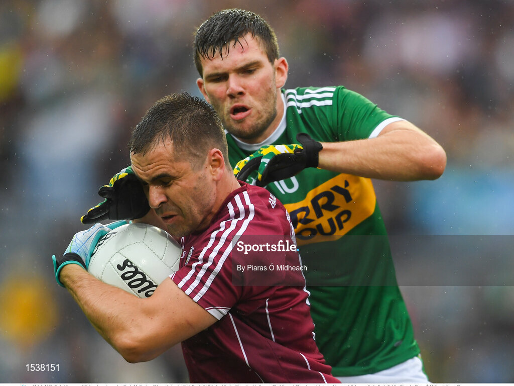 15 July 2018; Cathal Sweeney of Galway in action against Kevin McCarthy of Kerry during the GAA Football All-Ireland Senior Championship Quarter-Final Group 1 Phase 1 match between Kerry and Galway at Croke Park, Dublin. Photo by Piaras Ó Mídheach/Sportsfile