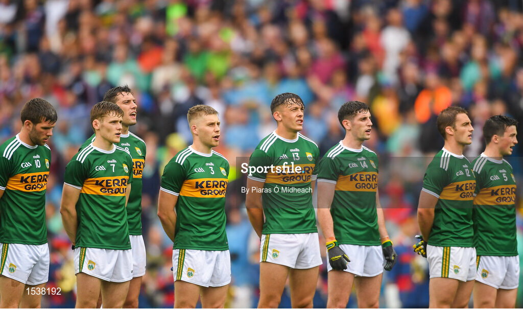 15 July 2018; Kerry players stand for Amhrán na bhFiann before the GAA Football All-Ireland Senior Championship Quarter-Final Group 1 Phase 1 match between Kerry and Galway at Croke Park, Dublin. Photo by Piaras Ó Mídheach/Sportsfile