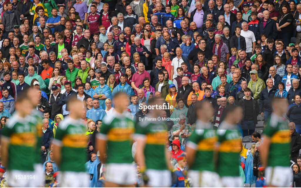 15 July 2018; Spectators in the Hogan Stand stand for Amhrán na bhFiann before the GAA Football All-Ireland Senior Championship Quarter-Final Group 1 Phase 1 match between Kerry and Galway at Croke Park, Dublin. Photo by Piaras Ó Mídheach/Sportsfile