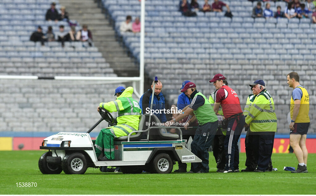 15 July 2018; Paul Conroy of Galway is helped off the field on a stretcher after picking up an injury during the GAA Football All-Ireland Senior Championship Quarter-Final Group 1 Phase 1 match between Kerry and Galway at Croke Park, Dublin. Photo by Piaras Ó Mídheach/Sportsfile