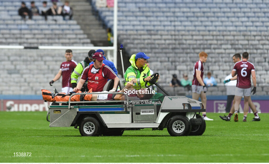 15 July 2018; Paul Conroy of Galway is helped off the field on a stretcher after picking up an injury during the GAA Football All-Ireland Senior Championship Quarter-Final Group 1 Phase 1 match between Kerry and Galway at Croke Park, Dublin. Photo by Piaras Ó Mídheach/Sportsfile