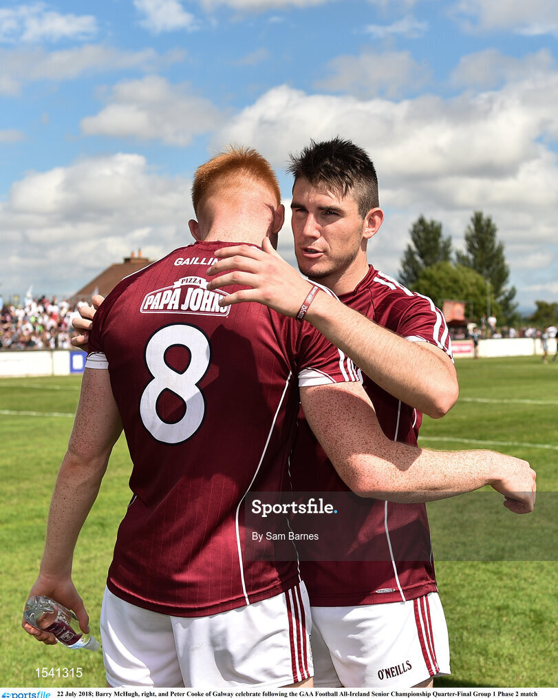 22 July 2018; Barry McHugh, right, and Peter Cooke of Galway celebrate following the GAA Football All-Ireland Senior Championship Quarter-Final Group 1 Phase 2 match between Kildare and Galway at St Conleth's Park in Newbridge, Co Kildare. Photo by Sam Barnes/Sportsfile