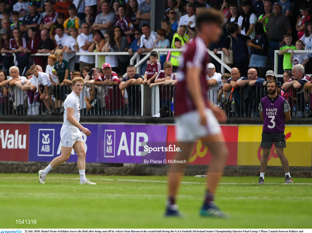 22 July 2018; Daniel Flynn of Kildare leaves the field after being sent off by referee Seán Hurson in the second half during the GAA Football All-Ireland Senior Championship Quarter-Final Group 1 Phase 2 match between Kildare and Galway at St Conleth's Park in Newbridge, Co Kildare. Photo by Piaras Ó Mídheach/Sportsfile