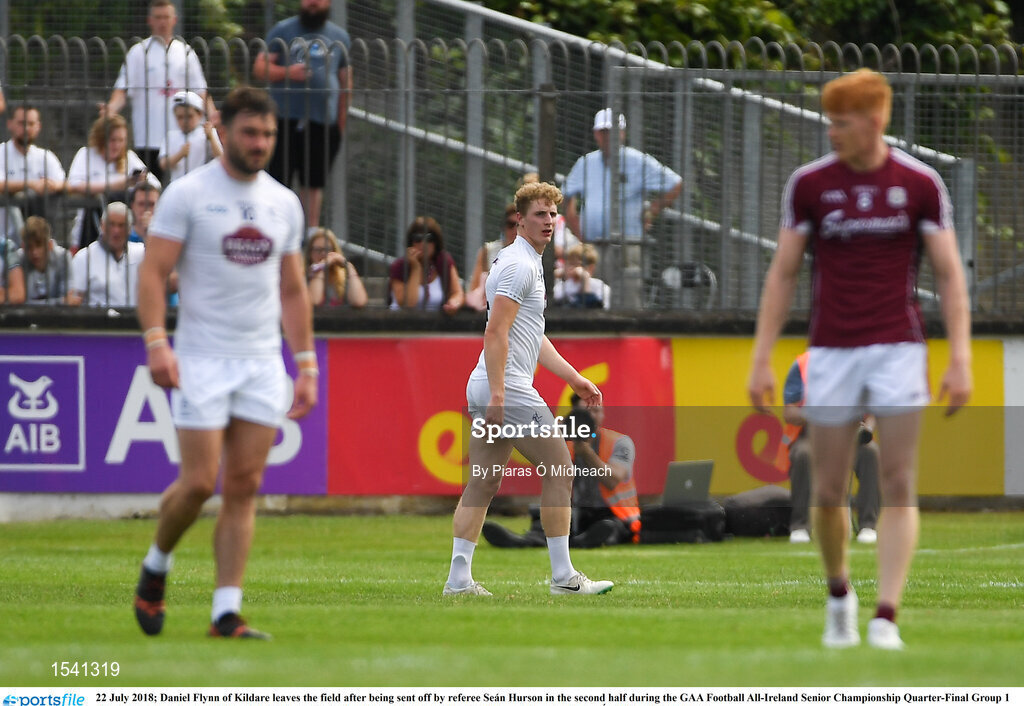 22 July 2018; Daniel Flynn of Kildare leaves the field after being sent off by referee Seán Hurson in the second half during the GAA Football All-Ireland Senior Championship Quarter-Final Group 1 Phase 2 match between Kildare and Galway at St Conleth's Park in Newbridge, Co Kildare. Photo by Piaras Ó Mídheach/Sportsfile