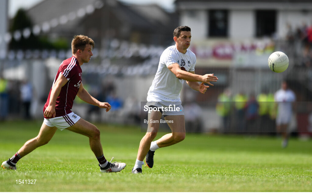 22 July 2018; Éamonn Callaghan of Kildare in action against Eoghan Kerin of Galway during the GAA Football All-Ireland Senior Championship Quarter-Final Group 1 Phase 2 match between Kildare and Galway at St Conleth's Park in Newbridge, Co Kildare. Photo by Sam Barnes/Sportsfile