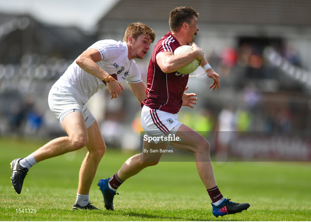 22 July 2018; Gareth Bradshaw of Galway in action against Kevin Feely of Kildare during the GAA Football All-Ireland Senior Championship Quarter-Final Group 1 Phase 2 match between Kildare and Galway at St Conleth's Park in Newbridge, Co Kildare. Photo by Sam Barnes/Sportsfile
