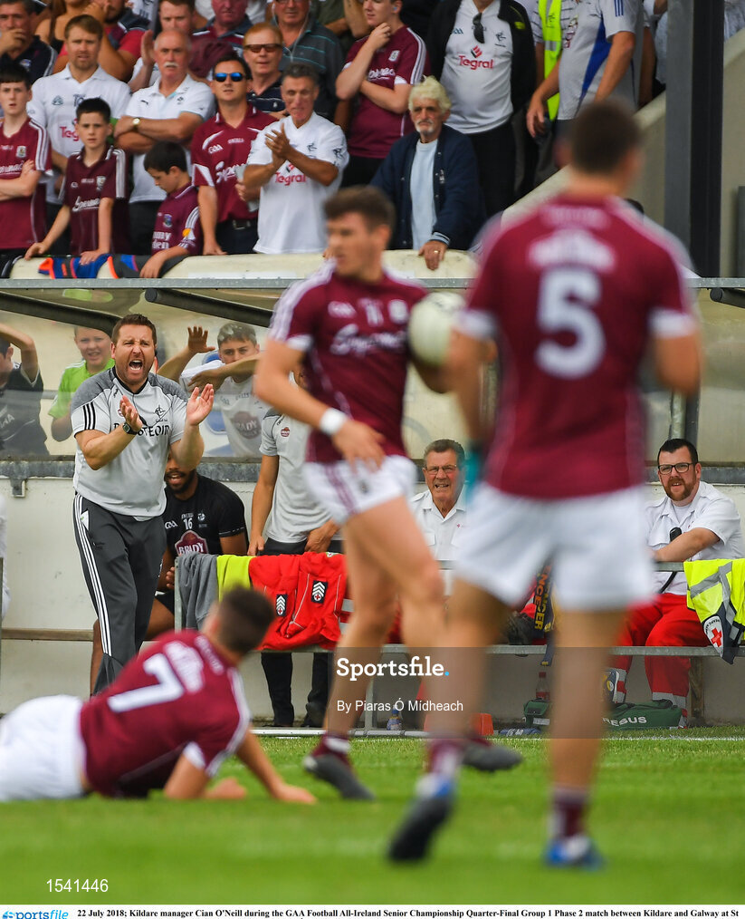 22 July 2018; Kildare manager Cian O'Neill during the GAA Football All-Ireland Senior Championship Quarter-Final Group 1 Phase 2 match between Kildare and Galway at St Conleth's Park in Newbridge, Co Kildare. Photo by Piaras Ó Mídheach/Sportsfile