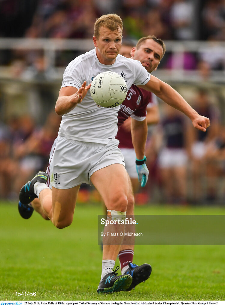 22 July 2018; Peter Kelly of Kildare gets past Cathal Sweeney of Galway during the GAA Football All-Ireland Senior Championship Quarter-Final Group 1 Phase 2 match between Kildare and Galway at St Conleth's Park in Newbridge, Co Kildare. Photo by Piaras Ó Mídheach/Sportsfile