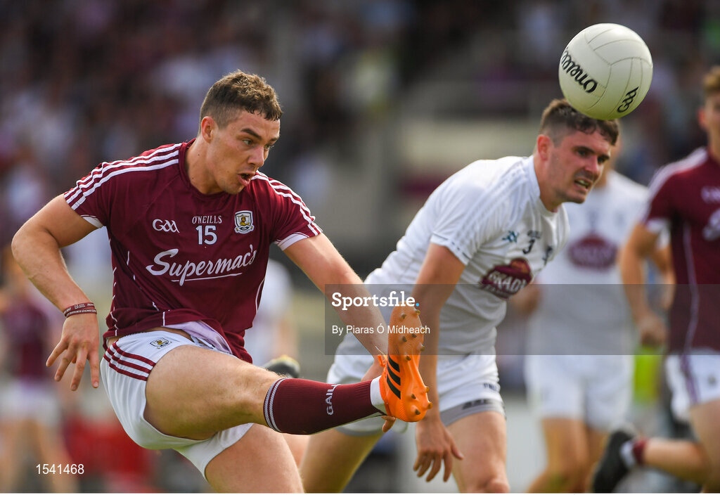 22 July 2018; Eamonn Brannigan of Galway scores a point under pressure from David Hyland of Kildare during the GAA Football All-Ireland Senior Championship Quarter-Final Group 1 Phase 2 match between Kildare and Galway at St Conleth's Park in Newbridge, Co Kildare. Photo by Piaras Ó Mídheach/Sportsfile