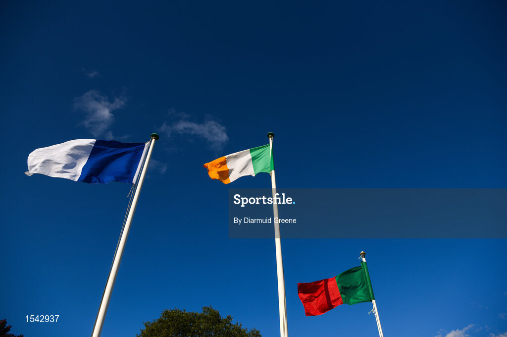 25 July 2018; A general view of Laois, Mayo, and Ireland flags prior to the All-Ireland Ladies Football U16 B Championship Final between Laois and Mayo at Duggan Park in Ballinasloe, Co. Galway. Photo by Diarmuid Greene/Sportsfile