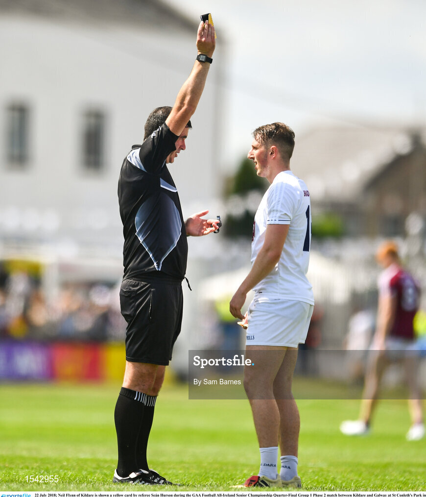 22 July 2018; Neil Flynn of Kildare is shown a yellow card by referee Seán Hurson during the GAA Football All-Ireland Senior Championship Quarter-Final Group 1 Phase 2 match between Kildare and Galway at St Conleth's Park in Newbridge, Co Kildare. Photo by Sam Barnes/Sportsfile