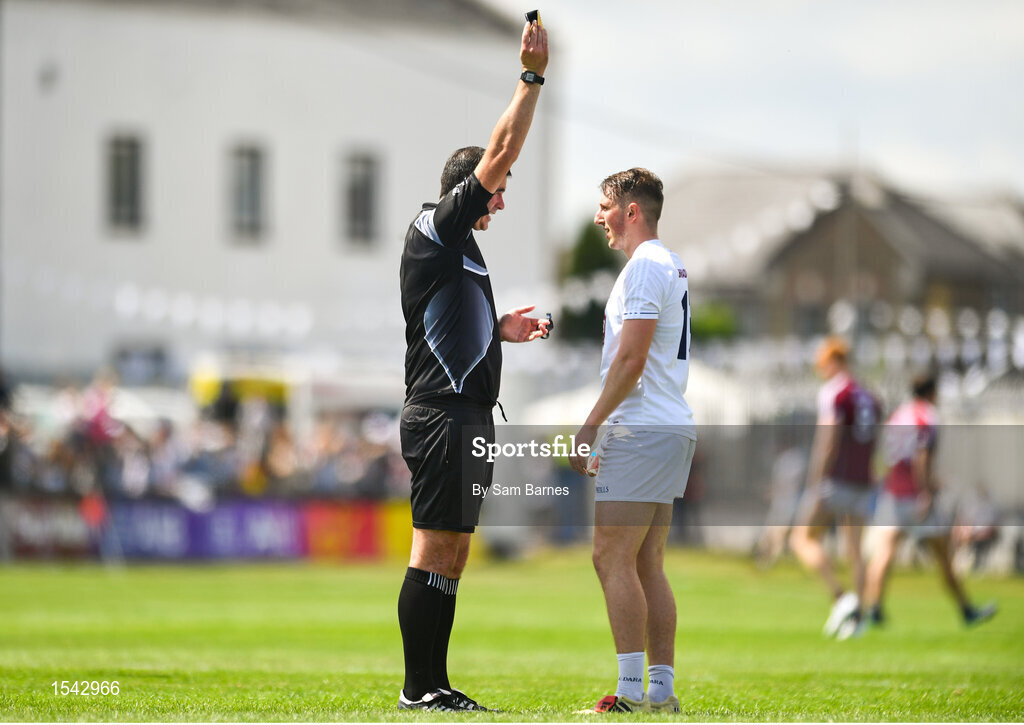 22 July 2018; Neil Flynn of Kildare is shown a yellow card by referee Seán Hurson during the GAA Football All-Ireland Senior Championship Quarter-Final Group 1 Phase 2 match between Kildare and Galway at St Conleth's Park in Newbridge, Co Kildare. Photo by Sam Barnes/Sportsfile