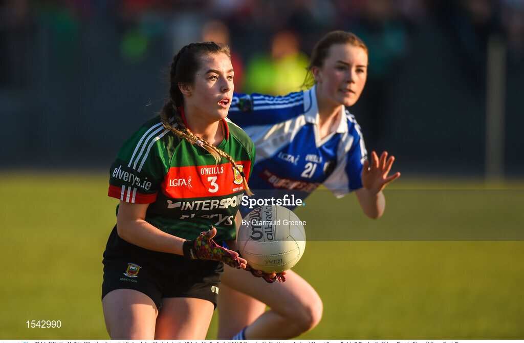 25 July 2018; Aine Moffatt of Mayo in action against Grainne Lalor of Laois during the All-Ireland Ladies Football U16 B Championship Final between Laois and Mayo at Duggan Park in Ballinasloe, Co. Galway. Photo by Diarmuid Greene/Sportsfile