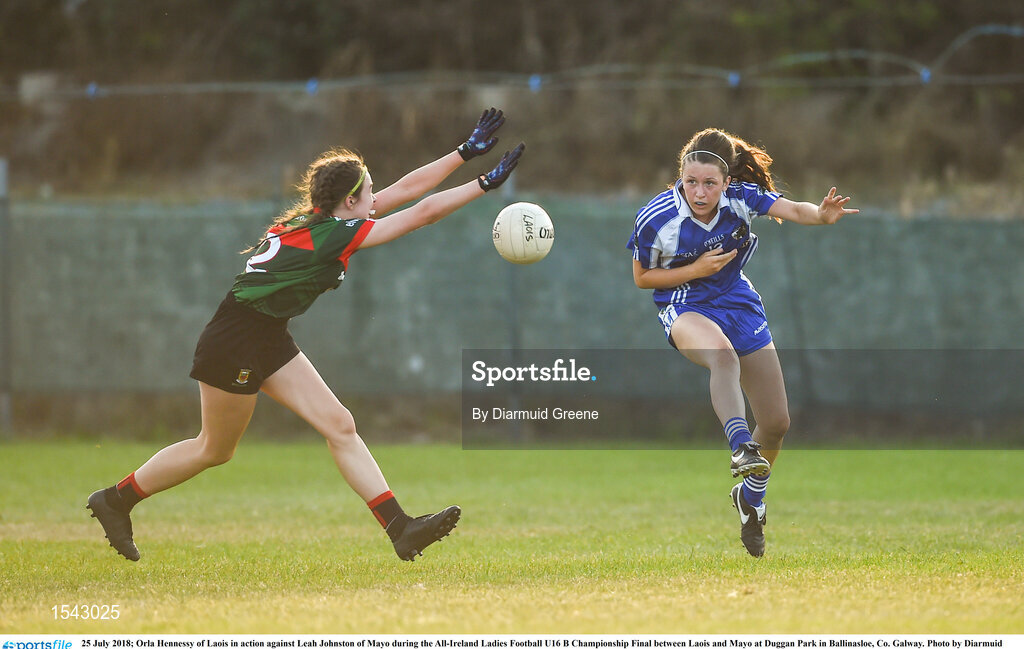 25 July 2018; Orla Hennessy of Laois in action against Leah Johnston of Mayo during the All-Ireland Ladies Football U16 B Championship Final between Laois and Mayo at Duggan Park in Ballinasloe, Co. Galway. Photo by Diarmuid Greene/Sportsfile