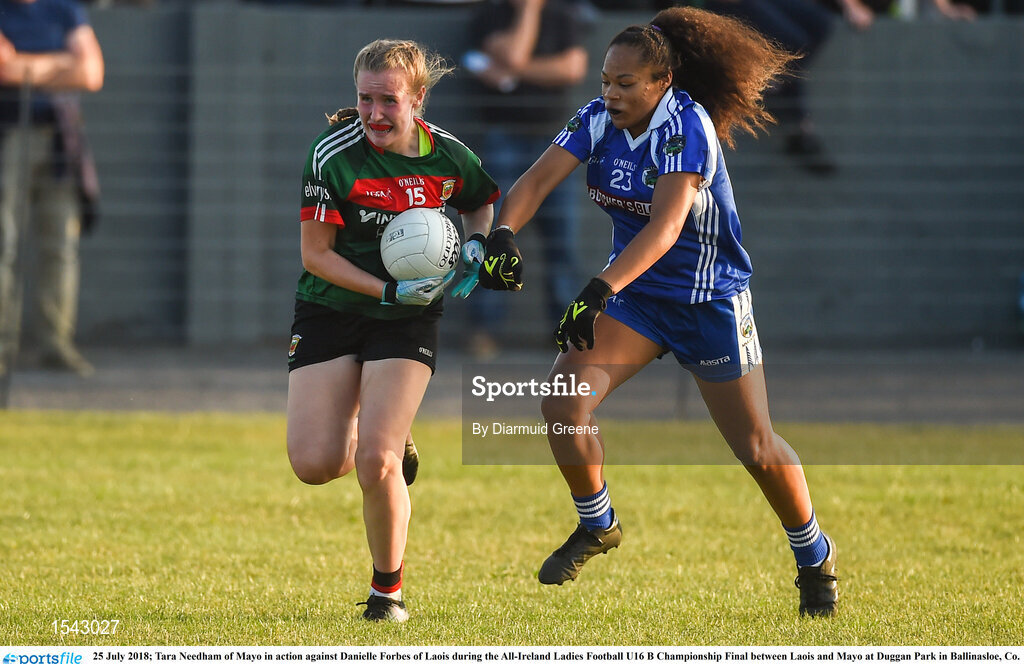 25 July 2018; Tara Needham of Mayo in action against Danielle Forbes of Laois during the All-Ireland Ladies Football U16 B Championship Final between Laois and Mayo at Duggan Park in Ballinasloe, Co. Galway. Photo by Diarmuid Greene/Sportsfile
