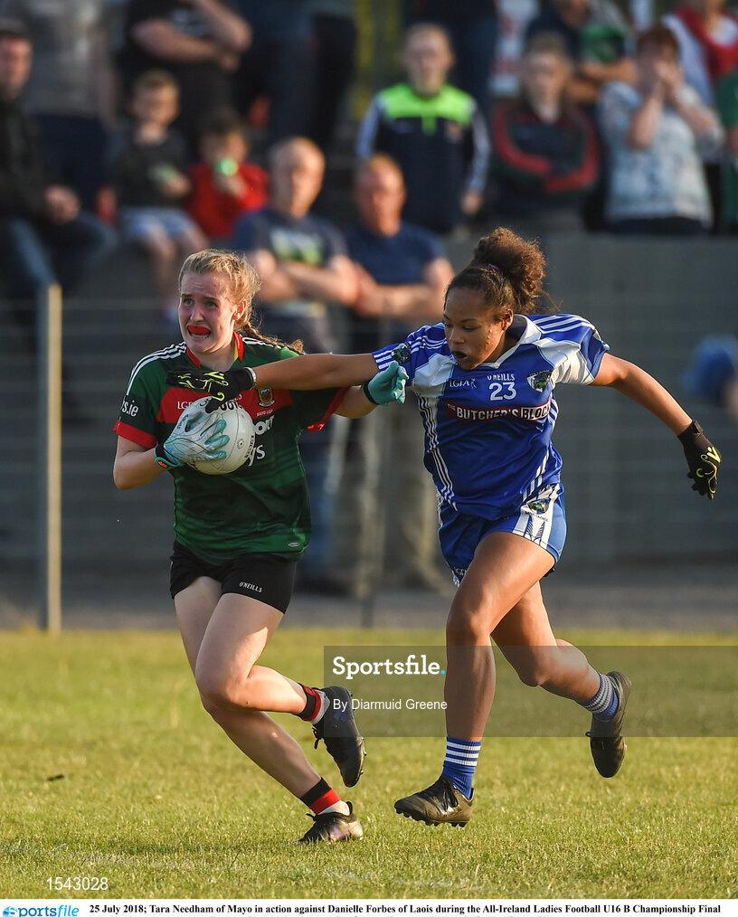 25 July 2018; Tara Needham of Mayo in action against Danielle Forbes of Laois during the All-Ireland Ladies Football U16 B Championship Final between Laois and Mayo at Duggan Park in Ballinasloe, Co. Galway. Photo by Diarmuid Greene/Sportsfile