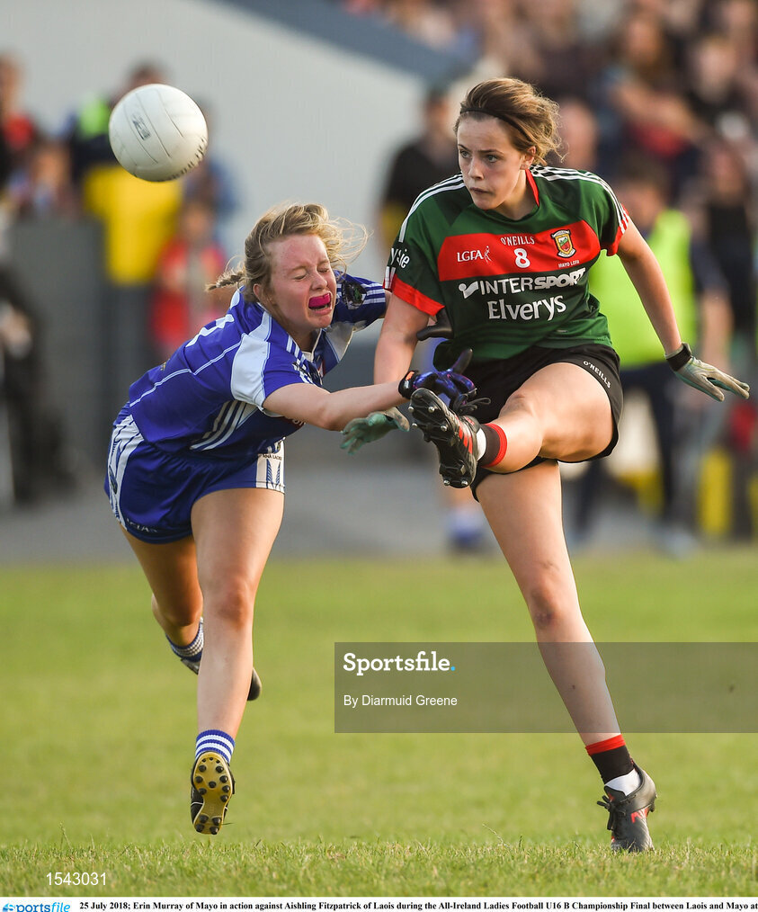 25 July 2018; Erin Murray of Mayo in action against Aishling Fitzpatrick of Laois during the All-Ireland Ladies Football U16 B Championship Final between Laois and Mayo at Duggan Park in Ballinasloe, Co. Galway. Photo by Diarmuid Greene/Sportsfile