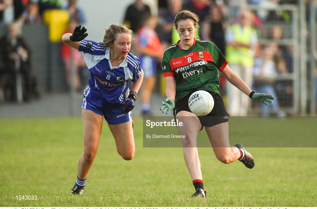 25 July 2018; Erin Murray of Mayo in action against Aishling Fitzpatrick of Laois during the All-Ireland Ladies Football U16 B Championship Final between Laois and Mayo at Duggan Park in Ballinasloe, Co. Galway. Photo by Diarmuid Greene/Sportsfile