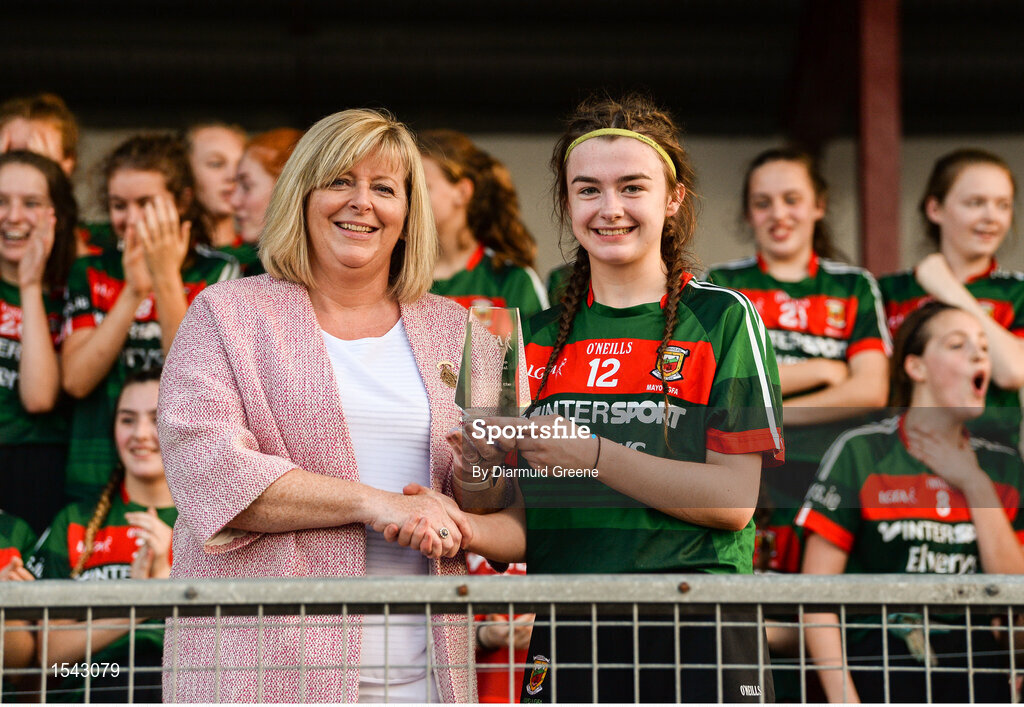 25 July 2018; Leah Johnston of Mayo is presented with the Player of the Match award by LGFA President Marie Hickey after the All-Ireland Ladies Football U16 B Championship Final between Laois and Mayo at Duggan Park in Ballinasloe, Co. Galway. Photo by Diarmuid Greene/Sportsfile