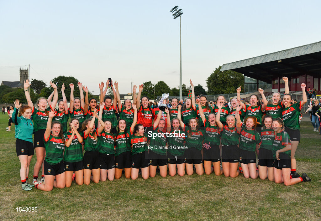 25 July 2018; Mayo captain Tara Needham and team-mates celebrate with the cup after the All-Ireland Ladies Football U16 B Championship Final between Laois and Mayo at Duggan Park in Ballinasloe, Co. Galway. Photo by Diarmuid Greene/Sportsfile