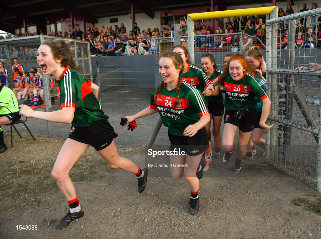25 July 2018; Mayo substitutes including Anna Lyons, Aoife Meehan, and Briana Fallon run on to celebrate with team-mates after the All-Ireland Ladies Football U16 B Championship Final between Laois and Mayo at Duggan Park in Ballinasloe, Co. Galway. Photo by Diarmuid Greene/Sportsfile