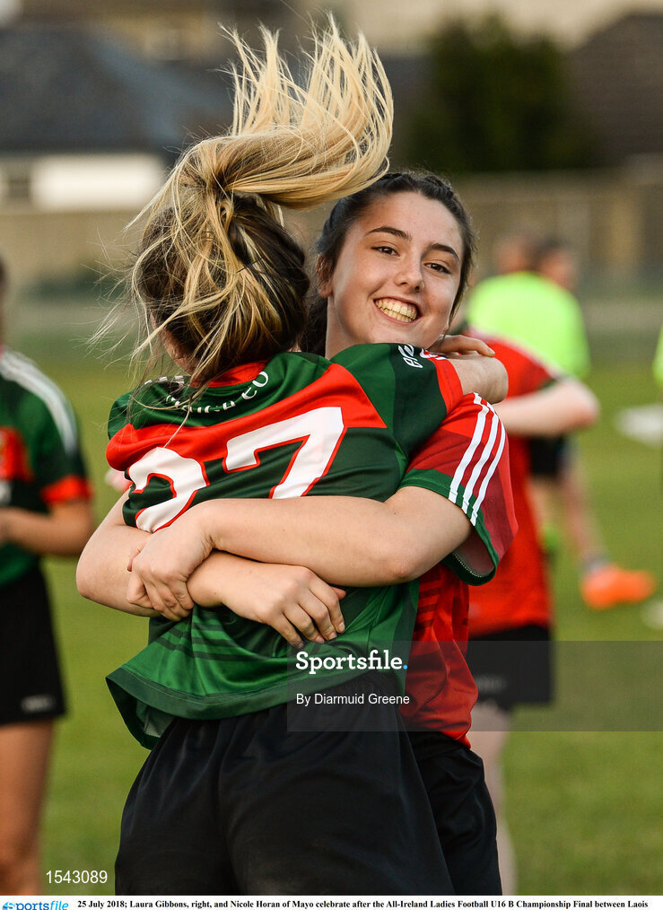 25 July 2018; Laura Gibbons, right, and Nicole Horan of Mayo celebrate after the All-Ireland Ladies Football U16 B Championship Final between Laois and Mayo at Duggan Park in Ballinasloe, Co. Galway. Photo by Diarmuid Greene/Sportsfile