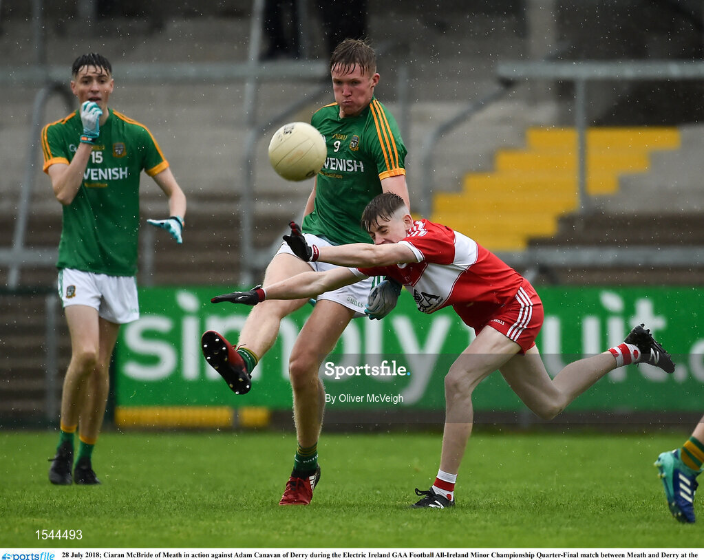 28 July 2018; Ciaran McBride of Meath in action against Adam Canavan of Derry during the Electric Ireland GAA Football All-Ireland Minor Championship Quarter-Final match between Meath and Derry at the Athletic Grounds in Armagh. Photo by Oliver McVeigh/Sportsfile