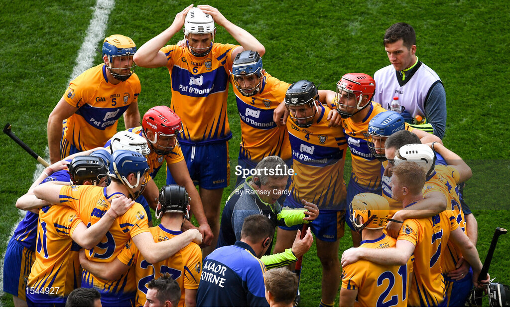 28 July 2018; Clare joint manager Donal Moloney speaks to his team ahead of the second period of extra-time in the GAA Hurling All-Ireland Senior Championship semi-final match between Galway and Clare at Croke Park in Dublin. Photo by Ramsey Cardy/Sportsfile