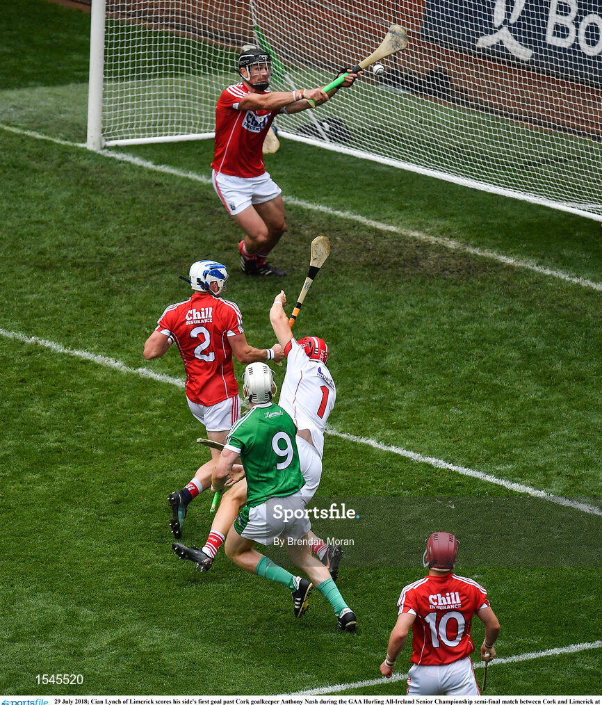29 July 2018; Cian Lynch of Limerick scores his side's first goal past Cork goalkeeper Anthony Nash during the GAA Hurling All-Ireland Senior Championship semi-final match between Cork and Limerick at Croke Park in Dublin. Photo by Brendan Moran/Sportsfile