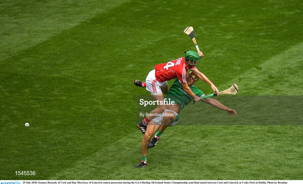 29 July 2018; Seamus Harnedy of Cork and Dan Morrissey of Limerick contest possession during the GAA Hurling All-Ireland Senior Championship semi-final match between Cork and Limerick at Croke Park in Dublin. Photo by Brendan Moran/Sportsfile