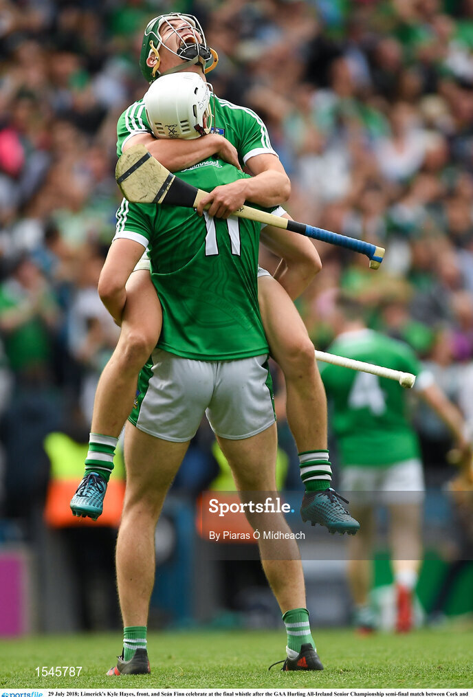 29 July 2018; Limerick's Kyle Hayes, front, and Seán Finn celebrate at the final whistle after the GAA Hurling All-Ireland Senior Championship semi-final match between Cork and Limerick at Croke Park in Dublin. Photo by Piaras Ó Mídheach/Sportsfile