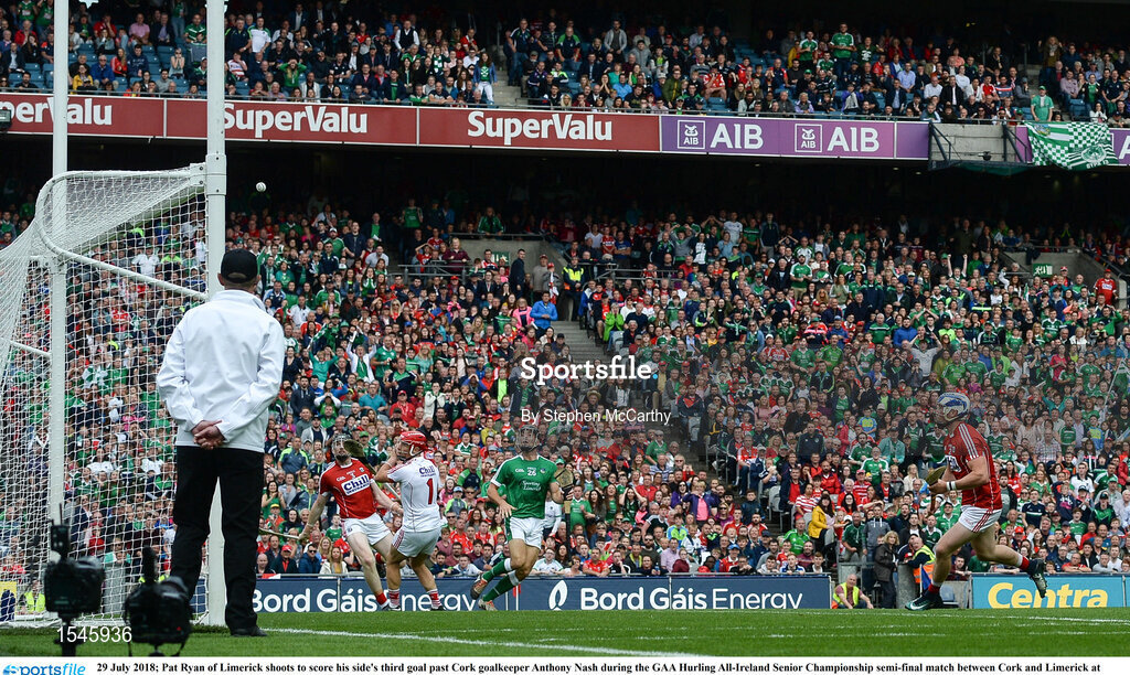 29 July 2018; Pat Ryan of Limerick shoots to score his side's third goal past Cork goalkeeper Anthony Nash during the GAA Hurling All-Ireland Senior Championship semi-final match between Cork and Limerick at Croke Park in Dublin. Photo by Stephen McCarthy/Sportsfile