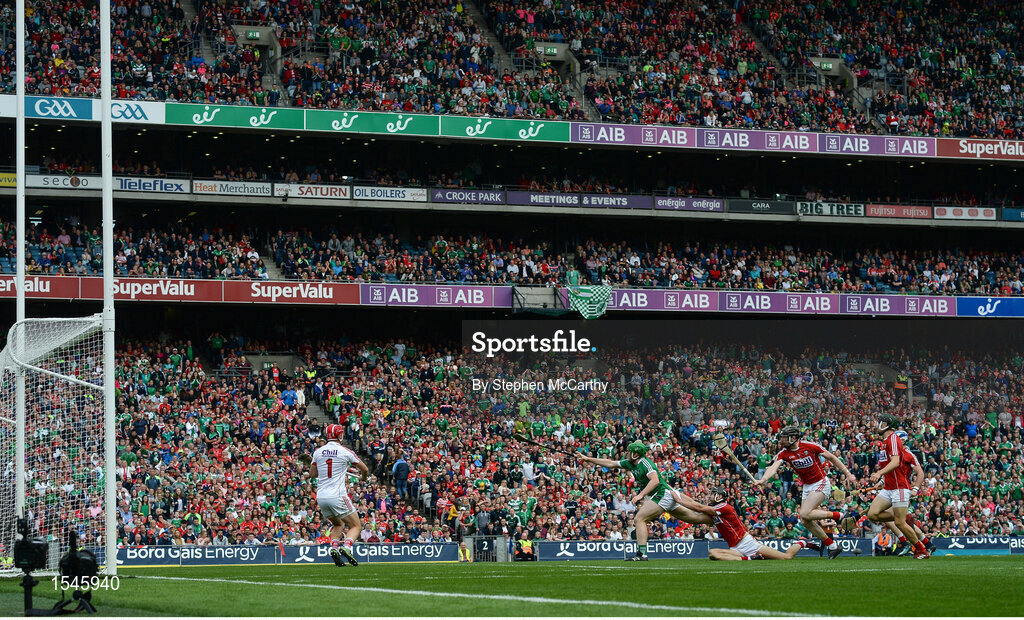 29 July 2018; Shane Dowling of Limerick attempts to strike the sliothar as he is fouled, in the square, by Mark Ellis of Cork during the GAA Hurling All-Ireland Senior Championship semi-final match between Cork and Limerick at Croke Park in Dublin. Photo by Stephen McCarthy/Sportsfile