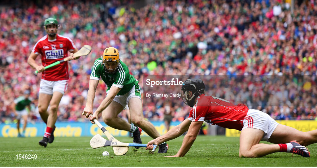 29 July 2018; Richie English of Limerick is tackled by Mark Ellis of Cork during the GAA Hurling All-Ireland Senior Championship semi-final match between Cork and Limerick at Croke Park in Dublin. Photo by Ramsey Cardy/Sportsfile