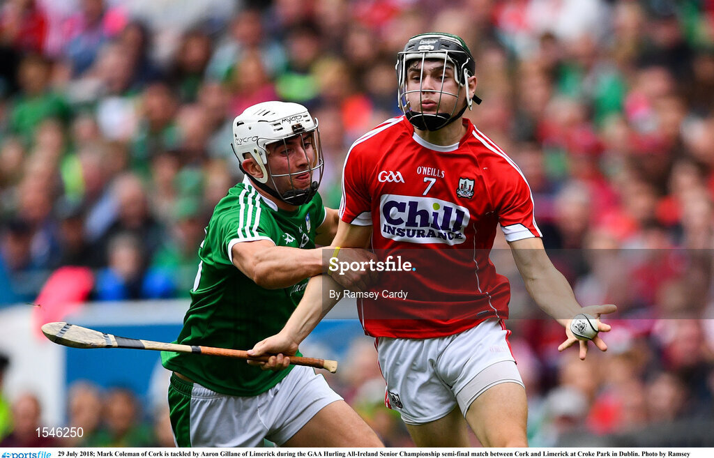 29 July 2018; Mark Coleman of Cork is tackled by Aaron Gillane of Limerick during the GAA Hurling All-Ireland Senior Championship semi-final match between Cork and Limerick at Croke Park in Dublin. Photo by Ramsey Cardy/Sportsfile