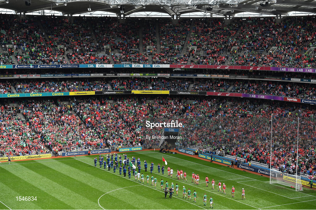 29 July 2018; The Cork and Limerick players walk behind the Artane School of Music Band during the pre-match parade prior to the GAA Hurling All-Ireland Senior Championship semi-final match between Cork and Limerick at Croke Park in Dublin. Photo by Brendan Moran/Sportsfile