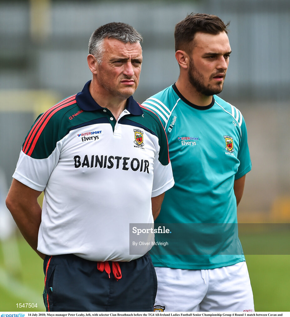 14 July 2018; Mayo manager Peter Leahy, left, with selector Cian Breathnach before the TG4 All-Ireland Ladies Football Senior Championship Group 4 Round 1 match between Cavan and Mayo at St Tiernach's Park, in Clones, Monaghan. Photo by Oliver McVeigh/Sportsfile