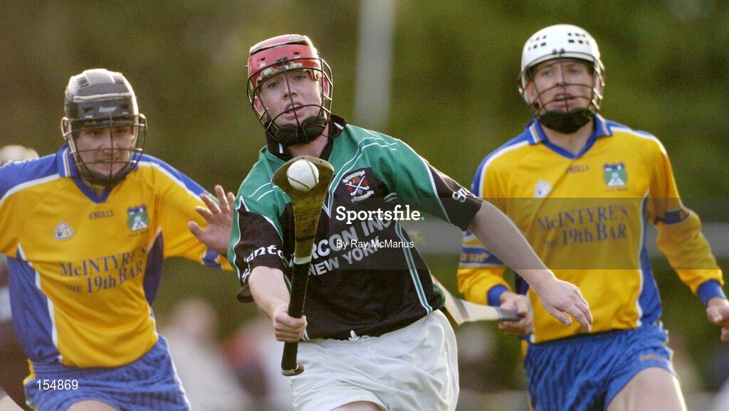 11 September 2004; Kevin Campbell, Setanta, in action against Joe Boyle, left, and Kieran Dowds, Burt. AIB Kilmacud Crokes All-Ireland Hurling Sevens 2004 Shield Final, Burt v Setanta, Kilmacud Crokes, Glenalbyn, Stillorgan, Dublin. Picture credit; Ray McManus / SPORTSFILE