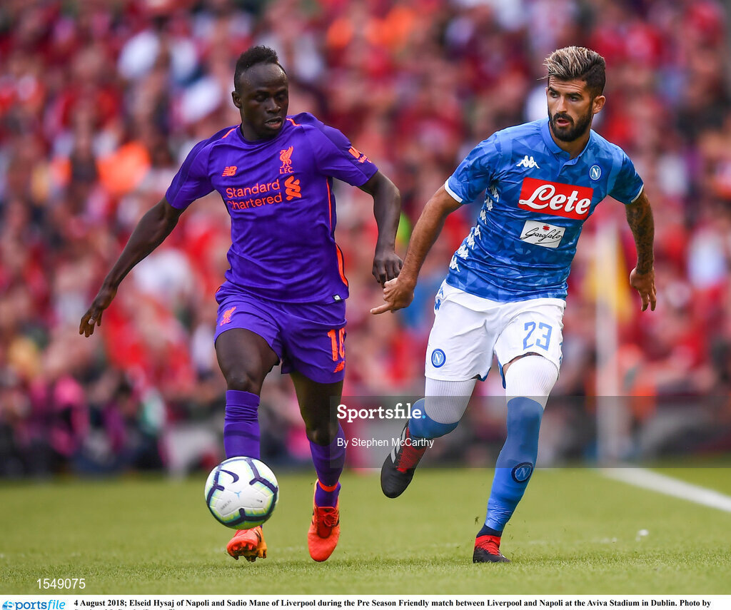 4 August 2018; Elseid Hysaj of Napoli and Sadio Mane of Liverpool during the Pre Season Friendly match between Liverpool and Napoli at the Aviva Stadium in Dublin. Photo by Stephen McCarthy/Sportsfile