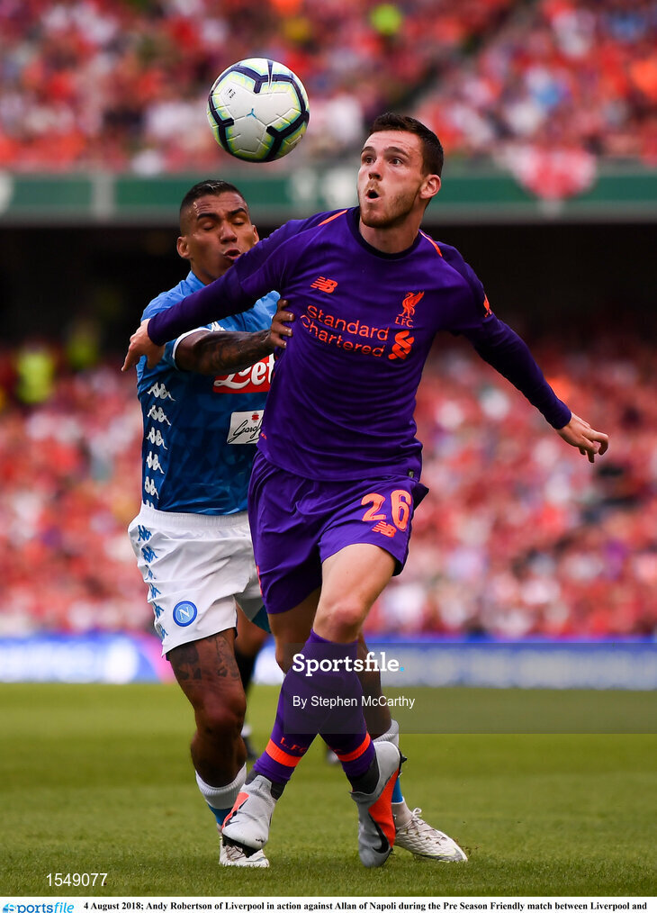 4 August 2018; Andy Robertson of Liverpool in action against Allan of Napoli during the Pre Season Friendly match between Liverpool and Napoli at the Aviva Stadium in Dublin. Photo by Stephen McCarthy/Sportsfile